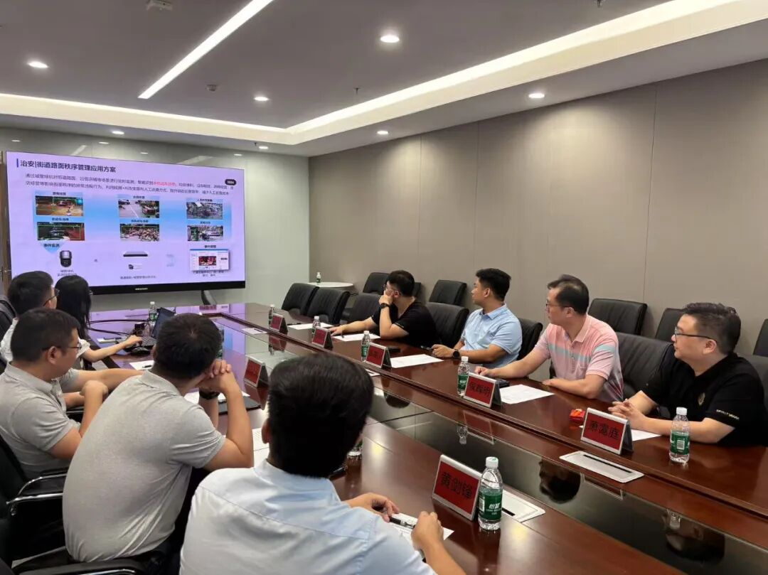 随后,双方举行了座谈会,就“智安番禺管控场景应用方案”进行了深入交流。讨论内容涉及智能安防设备部署、AI分析技术应用、智慧管理平台建设等多个方面,重点探讨了如何借助技术创新,提升番禺区治安防控体系的智能化水平。双方还就技术方案定制、系统兼容性优化和数据共享机制等方面充分交换了意见。